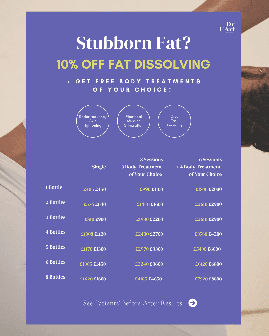 A doctor-led fat dissolving treatment designed to target stubborn areas that don’t respond to diet or exercise. Enhance your results with complimentary body treatments, as part of our spring & summer offer - start now for best results.